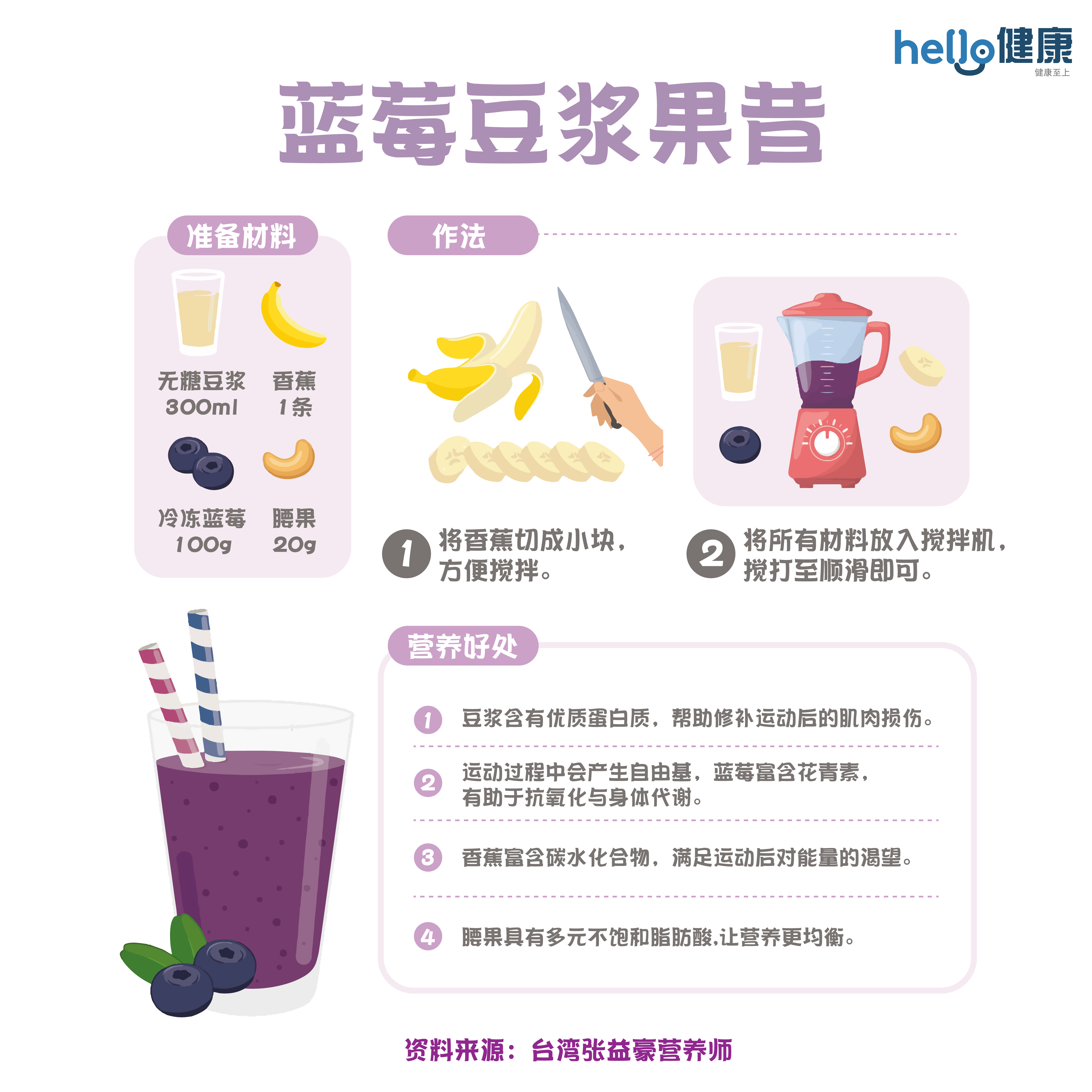 如果觉得单喝豆浆口味较为单一,不妨动手制作一杯蓝莓豆浆果昔,为日常饮食增添变化。这款果昔结合豆浆的植物性蛋白与蓝莓的抗氧化营养,制作过程简单,只需将材料放入调理机搅打即可完成,适合作为早餐、运动后补充或健康点心。所需材料与制作步骤如下图所示。