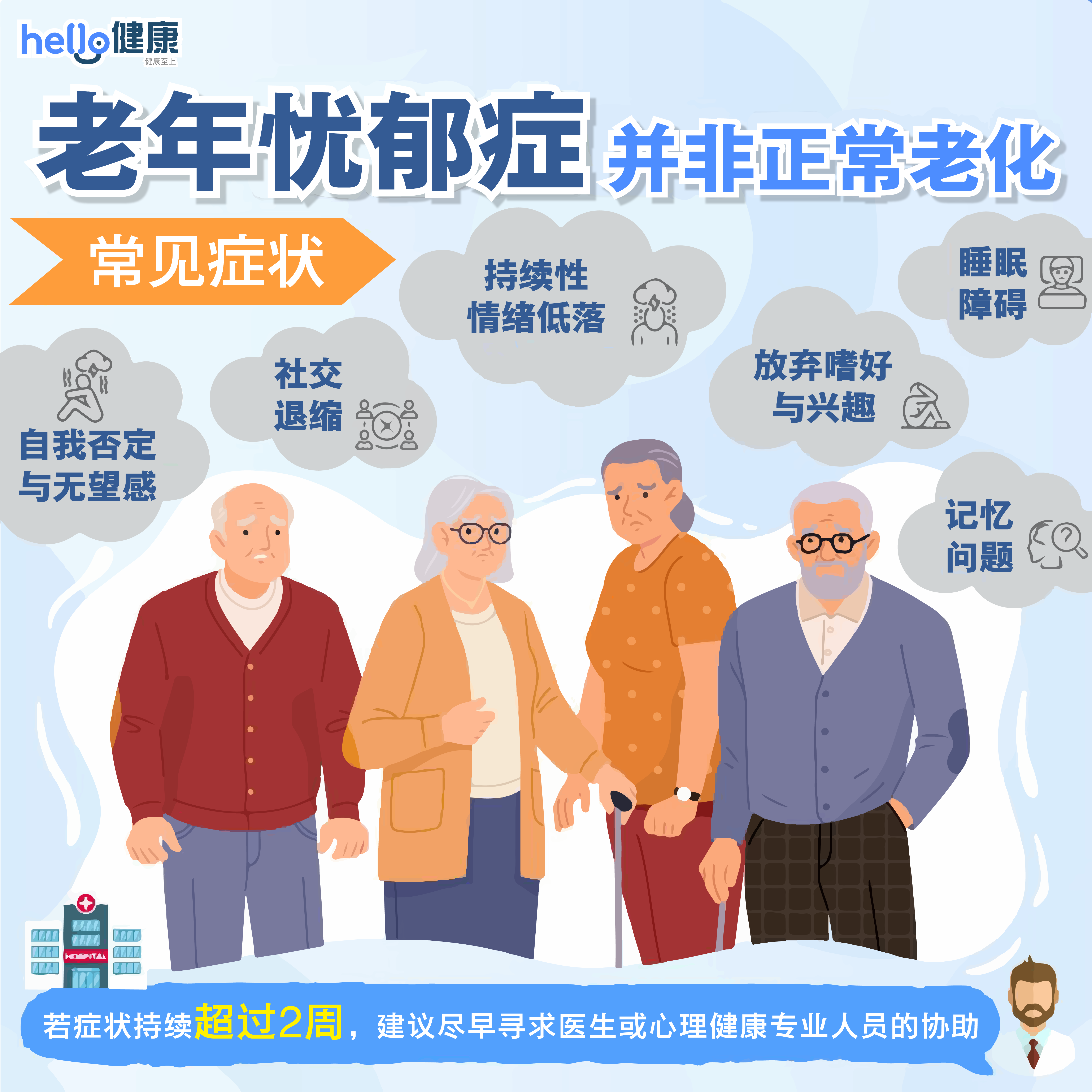 老年忧郁症其实比一般人想像的更常见,其症状包括: